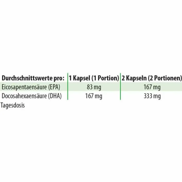 DHA trägt zur Erhaltung der normalen Sehkraft und der normalen Gehirnfunktion bei (bei einer täglichen Aufnahme von 250 mg DHA). DHA und EPA tragen zur normalen Herzfunktion bei (bei einer täglichen Aufnahme von 250 mg DHA und EPA).