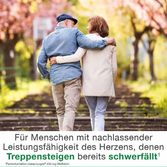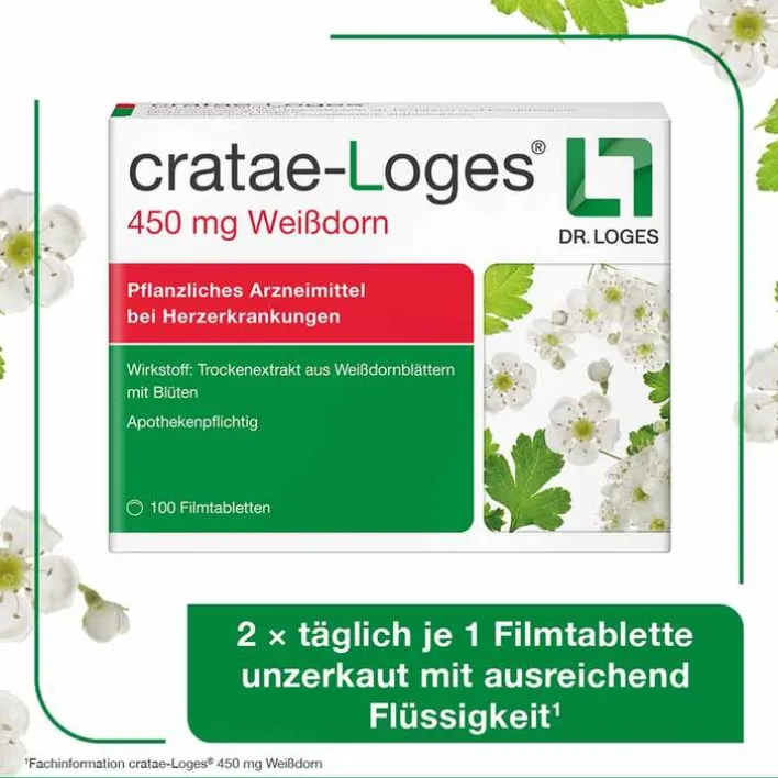 cratae-Loges® 450 mg Weißdorn, Wirkstoff: Trockenextrakt aus Weißdornblättern mit Blüten. Anwendungsgebiete: Nachlassende Leistungsfähigkeit des Herzens entsprechend Stadium II nach NYHA. Zu Risiken und Nebenwirkungen lesen Sie die Packungsbeilage und fragen Sie Ihre Ärztin, Ihren Arzt oder in Ihrer Apotheke. Stand: 11/2023