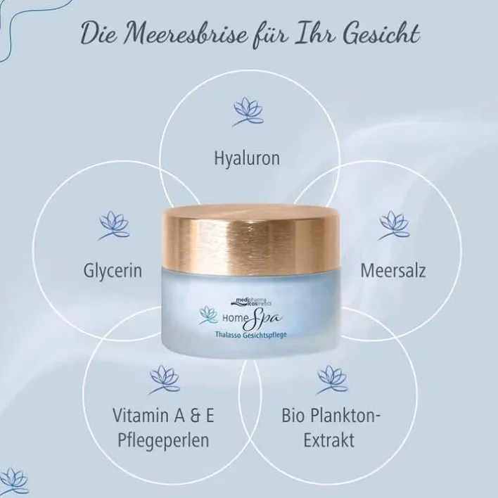 Tauchen Sie ein in die erfrischende Welt der Home Spa Thalasso Gesichtspflege von medipharma cosmetics und genießen Sie den beruhigenden Effekt des Meeres auf der Haut.