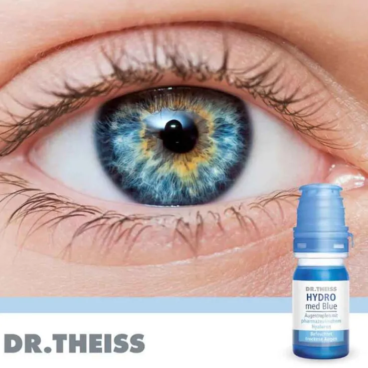 DR. Theiss Hydro med Blue Augentropfen zur verbesserten Befeuchtung, Linderung und Pflege bei Beschwerden des trockenen Auges.
