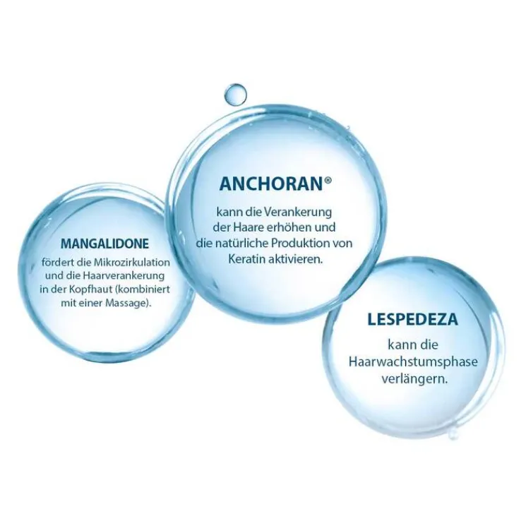 Anchoran, ein Mariendistel-Extrakt, stimuliert das Haarwachstum, indem es direkt auf die Zellen am Ursprung der Haare einwirkt. Zusätzlich hat es die Eigenschaft, Haare in den Follikeln zuverankern. Darüber hinaus aktiviert Anchoran die natürliche Produktion von Keratin K75 für stärkeres, dichteres und widerstandsfähigeres Haar.