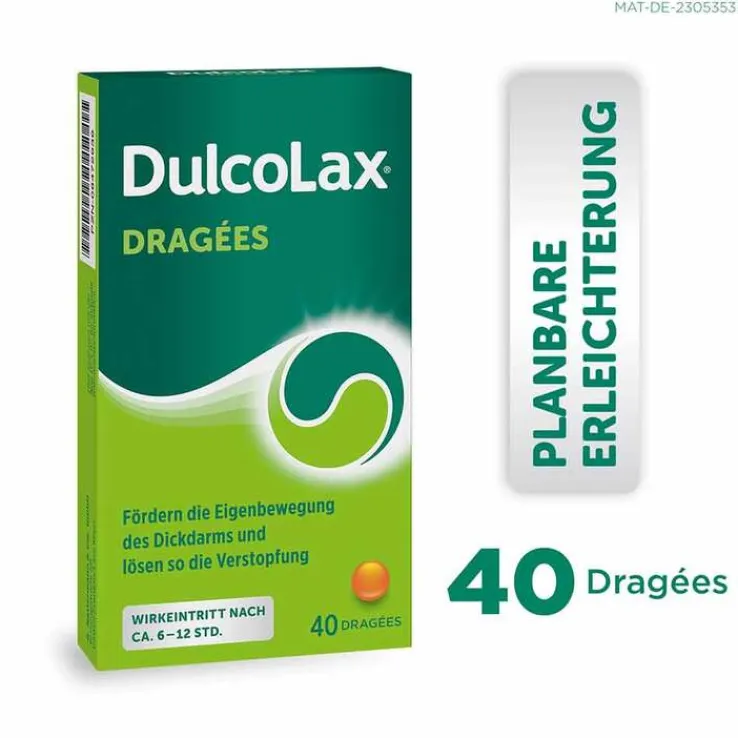Dulcolax® Dragées. Wirkstoff: Bisacodyl Anwendungsgebiet: Zur Anwendung bei Verstopfung, bei Erkrankungen, die eine erleichterte Darmentleerung erfordern sowie zur Darmentleerung bei Behandlungsmaßnahmen u. Maßnahmen zum Erkennen von Krankheiten (therapeut. u. diagnost. Eingriffe) am Darm. Hinweis: Wie andere Abführmittel sollten Dulcolax® Dragées ohne ärztl. Abklärung der Verstopfungsursache nicht täglich oder über einen längeren Zeitraum eingenommen werden. Enthält den Farbstoff Gelborange S, Lactose u. Sucrose. Trägt nicht zur Gewichtsabnahme bei. Der gleichzeitige Gebrauch von anderen Abführmitteln kann die Nebenwirkungen im Magen-Darmtrakt verstärken. Packungsbeilage beachten. Apothekenpflichtig. Zu Risiken und Nebenwirkungen lesen Sie die Packungsbeilage und fragen Sie Ihre Ärztin, Ihren Arzt oder in Ihrer Apotheke. A. Nattermann & Cie. GmbH, Brüningstraße 50, 65929 Frankfurt am Main. Stand: Juli 2022. MAT-DE-2007106
