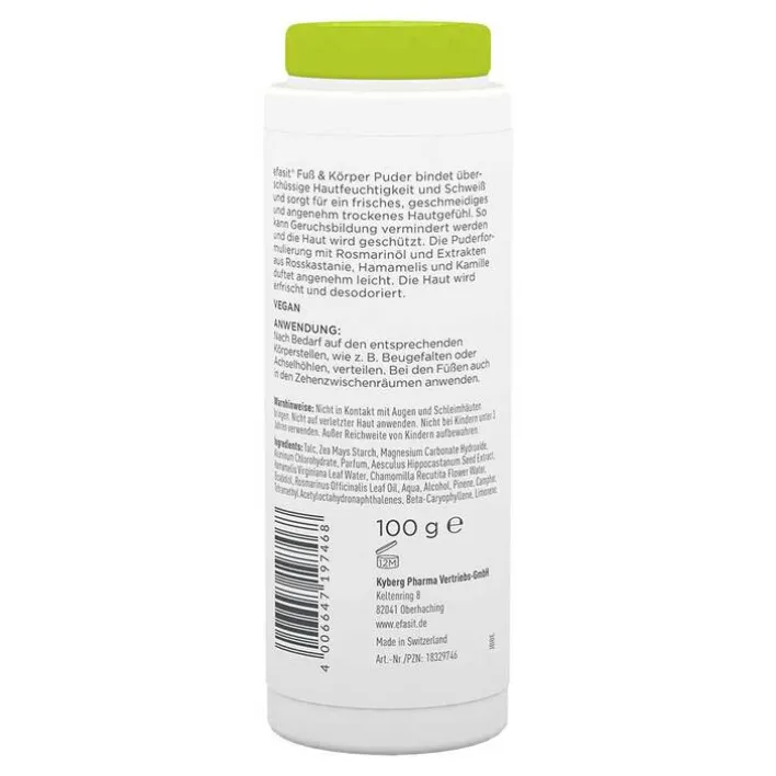 Efasit Fuß & Körper Puder bindet überschüssige Hautfeuchtigkeit sowie Schweiß und sorgt für ein frisches, geschmeidiges und angenehm trockenes Hautgefühl. So kann Geruchsbildung vermindert werden und die Haut wird geschützt. Die Puderformulierung mit Rosmarinöl und Extrakten aus Rosskastanie, Hamamelis und Kamille duftet angenehm leicht. Die Haut wird erfrischt und desodoriert.