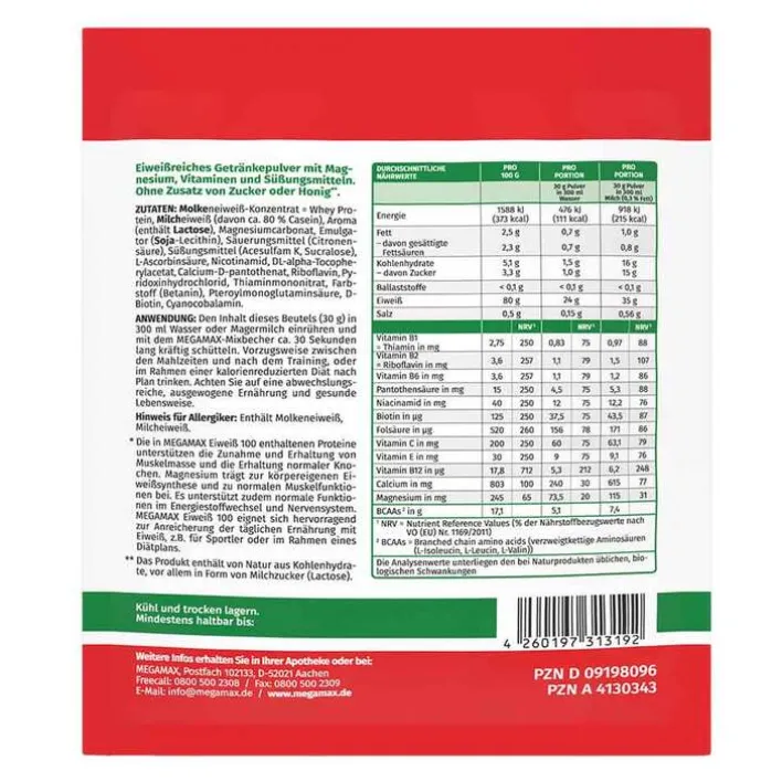 MEGAMAX Eiweiß 100 besteht aus Milcheiweiß und Molkenprotein. Diese Proteine unterstützen Ihren Körper bei der Zunahme und Erhaltung von Muskelmasse und tragen auch zu einer Erhaltung normaler Knochen bei. Daneben enthält MEGAMAX Eiweiß 100 auch eine Auswahl von Vitaminen. Vitamin B12 zum Beispiel trägt zu einem normalen Ablauf Ihres Energiestoffwechsels bei und Vitamin C unterstützt die normale Funktion Ihres Immunsystems während und nach intensiver körperlicher Betätigung.