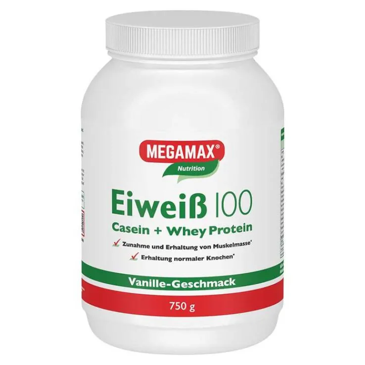 MEGAMAX Eiweiß 100 besteht aus Milcheiweiß und Molkenprotein. Diese Proteine unterstützen Ihren Körper bei der Zunahme und Erhaltung von Muskelmasse und tragen auch zu einer Erhaltung normaler Knochen bei. Daneben enthält MEGAMAX Eiweiß 100 auch eine Auswahl von Vitaminen. Vitamin B12 zum Beispiel trägt zu einem normalen Ablauf Ihres Energiestoffwechsels bei und Vitamin C unterstützt die normale Funktion Ihres Immunsystems während und nach intensiver körperlicher Betätigung.