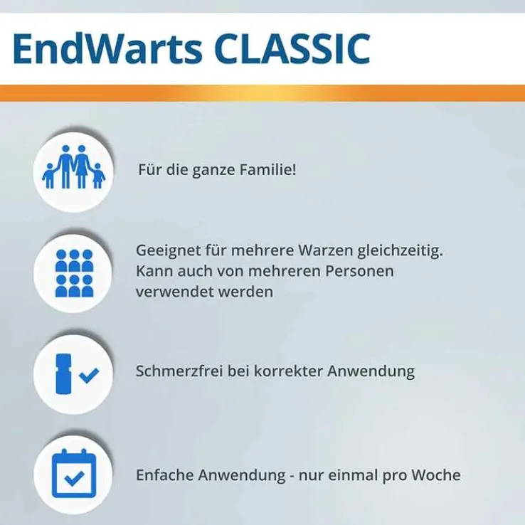 - Für die gesamte Familie: EndWarts® CLASSIC ist auch für Kinder geeignet (vor der Behandlung von Kindern unter 4 Jahren den Kinderarzt/die Kinderärztin konsultieren). Gebrauchsanweisung beachten!