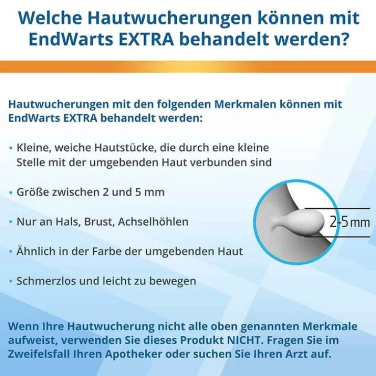 Verwenden Sie EndWarts® EXTRA gegen Stielwaren nicht bei Kindern und Jugendlichen unter 18 Jahren, wenn Sie nicht sicher sind, ob die Hautwucherung eine Stielwarze ist. Versuchen Sie nicht, Muttermale, Leberflecken, pigmentierte Läsionen, behaarte, harte, kürzlich blutende und unregelmäßige Wucherungen oder alles andere, was möglicherweise Hautkrebs (Melanom) sein könnte, zu entfernen.