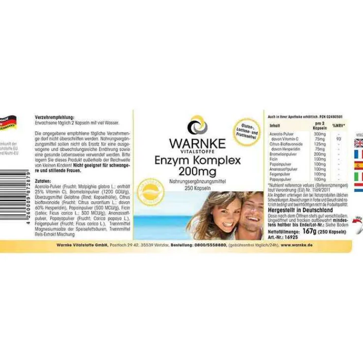 Acerola-Pulver (Frucht; Malpighia glabra L.; enthält 25% Vitamin C), Bromelainpulver (1200 GDU/g), Überzugsmittel Gelatine (Rind; Kapselhülle), Citrus bioflavonoide (Frucht; Citrus aurantium L.; davon 60% Hesperidin), Papainpulver (500 MCU/g), Ficin (Latex; Ficus carica L.; 500 MCU/g), Ananassaftpulver, Papayapulver (Frucht; Carica papaya L.), Feigenpulver (Frucht; Ficus carica L.), Trennmittel Magnesiumsalze der Speisefettsäuren, Trennmittel Reis-Extrakt Mischung