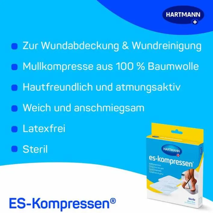 Stellen Sie sich vor, Sie befinden sich in einer Situation, in der schnelle und zuverlässige Wundversorgung gefragt ist. Genau in solchen Momenten beweisen die HARTMANN ES-Kompressen ihre Wertigkeit. Als der Klassiker unter den Mullkompressen sorgen die eingeschlagenen Schnittkanten dafür, dass keine lästigen Randfäden in die Wunde gelangen. Diese durchdachte Konstruktion erlaubt es Ihnen, sich ganz auf die effiziente Versorgung Ihrer Verletzung zu konzentrieren. Die ES-Kompresse lässt sich vielseitig einsetzen, da sie mehrfach aufklappbar ist und somit auch große Körperstellen mühelos abdeckt. Dank ihrer Sterilität eignet sie sich perfekt für die Erstversorgung von verschmutzten und nässenden Wunden, schafft ein sauberes Umfeld und unterstützt die Heilung optimal.