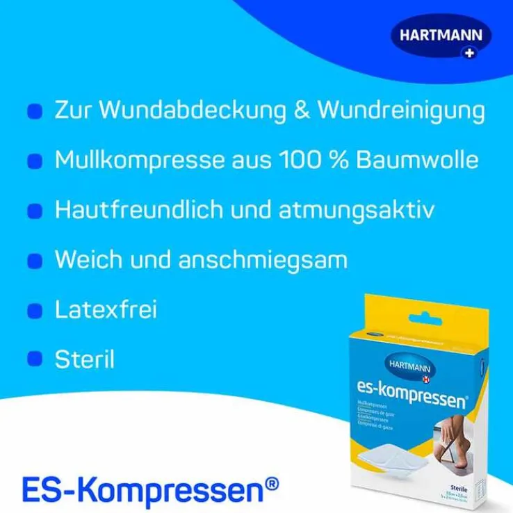 Stellen Sie sich vor, Sie befinden sich in einer Situation, in der schnelle und zuverlässige Wundversorgung gefragt ist. Genau in solchen Momenten beweisen die HARTMANN ES-Kompressen ihre Wertigkeit. Als der Klassiker unter den Mullkompressen sorgen die eingeschlagenen Schnittkanten dafür, dass keine lästigen Randfäden in die Wunde gelangen. Diese durchdachte Konstruktion erlaubt es Ihnen, sich ganz auf die effiziente Versorgung Ihrer Verletzung zu konzentrieren. Die ES-Kompresse lässt sich vielseitig einsetzen, da sie mehrfach aufklappbar ist und somit auch große Körperstellen mühelos abdeckt. Dank ihrer Sterilität eignet sie sich perfekt für die Erstversorgung von verschmutzten und nässenden Wunden, schafft ein sauberes Umfeld und unterstützt die Heilung optimal.