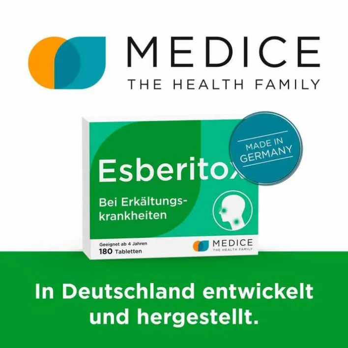 Esberitox®. Anwendungsgebiet: zur unterstützenden Therapie viraler Erkältungskrankheiten. Zu Risiken und Nebenwirkungen lesen Sie die Packungsbeilage und fragen Sie Ihre Ärztin, Ihren Arzt oder in Ihrer Apotheke. Apothekenpflichtig. Stand: 01/2024. Schaper & Brümmer GmbH & Co. KG, Bahnhofstr. 35, 38259 Salzgitter