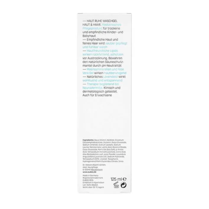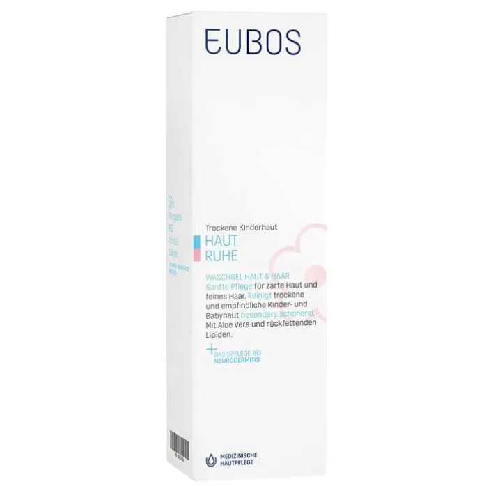 Das Eubos Kinder Haut Ruhe Waschgel für Haut und Haar ist ein medizinisches Pflegeprodukt für trockene und empfindliche Kinder- und Babyhaut. Empfindliche Haut und feines Haar wird sauber gepflegt und fühlbar weich. Hautfreundliche Lipide wirken rückfettend und schützen vor Austrocknung. Das Waschgel bewahrt den natürlichen Säureschutzmantel durch pH-Neutralität. Die enthaltenen Meeresmineralien und Aloe Vera Gel wirken hautberuhigend. Natürliches Lavendelöl wirkt wohltuend und entspannend. Eubos Kinder Haut Ruhe Waschgel ist auch Therapie begleitend bei Neurodermitis einsetzbar. Es wurde klinisch und dermatologisch getestet und eignet sich auch für Erwachsene.