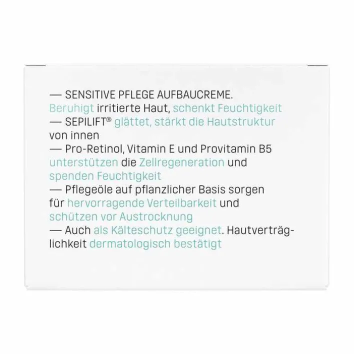Der enthaltene Wirkstoffkomplex Sepilift glättet und stärkt die Hautstruktur von innen. Pro-Retinol, Vitamin E und Provitamin B5 unterstützen die Zellregeneration und spenden Feuchtigkeit. Die wertvollen Pflegeöle auf pflanzlicher Basis sorgen für hervorragende Verteilbarkeit und schützen vor der Austrocknung der Haut. Die Eubos sensitive Pflege Aufbaucreme ist auch als Kälteschutz geeignet. Die Hautverträglichkeit wurde dermatologisch bestätigt.