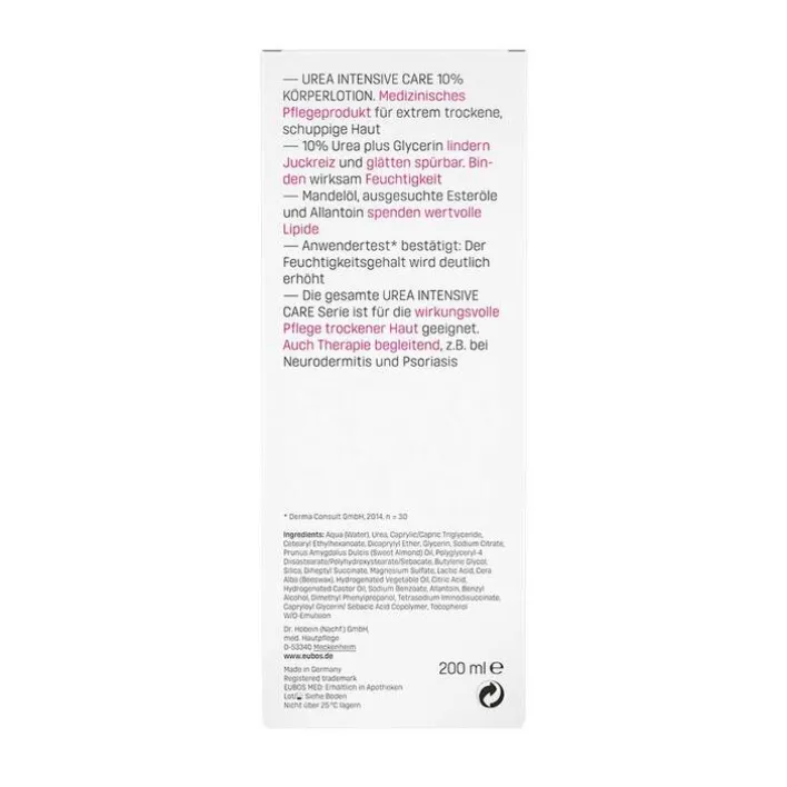Eubos 10 % Urea Körperlotion versorgt die Haut intensiv mit feuchtigkeitsbindendem Urea und erhöht so deutlich die Hydratationsfähigkeit der Haut. Urea wirkt auch keratolytisch, d. h., oberflächliche Hautschuppen werden gelöst, so dass eine hautglättende Wirkung erzielt wird. Allantoin sowie eine spezielle Lipidkombination mit Süßmandelöl helfen, die natürlichen Schutzfunktion der Haut zu stärken und vor übermäßigem Feuchtigkeitsverlust zu bewahren.