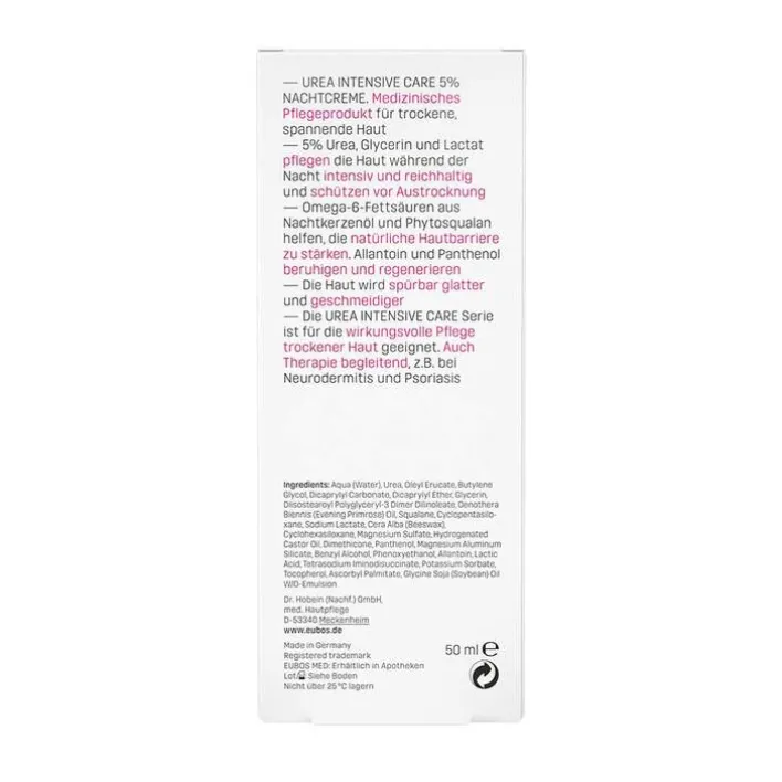 Eubos Trockene Haut Urea 5 % Nachtcreme ist ein medizinisches Pflegeprodukt für trockene, spannende Haut mit 5% Urea, Glycerin und Lactat. Die Inhaltsstoffe pflegen die Haut während der Nacht intensiv und reichhaltig und schützen vor Austrocknung. Omega-6-Fettsäuren aus Nachtkerzenöl und Phytosqualan helfen, die natürliche Hautbarriere zu stärken. Allantoin und Panthenol beruhigen und regenerieren. Die Haut wird spürbar glatter und geschmeidiger. Urea bindet Feuchtigkeit.