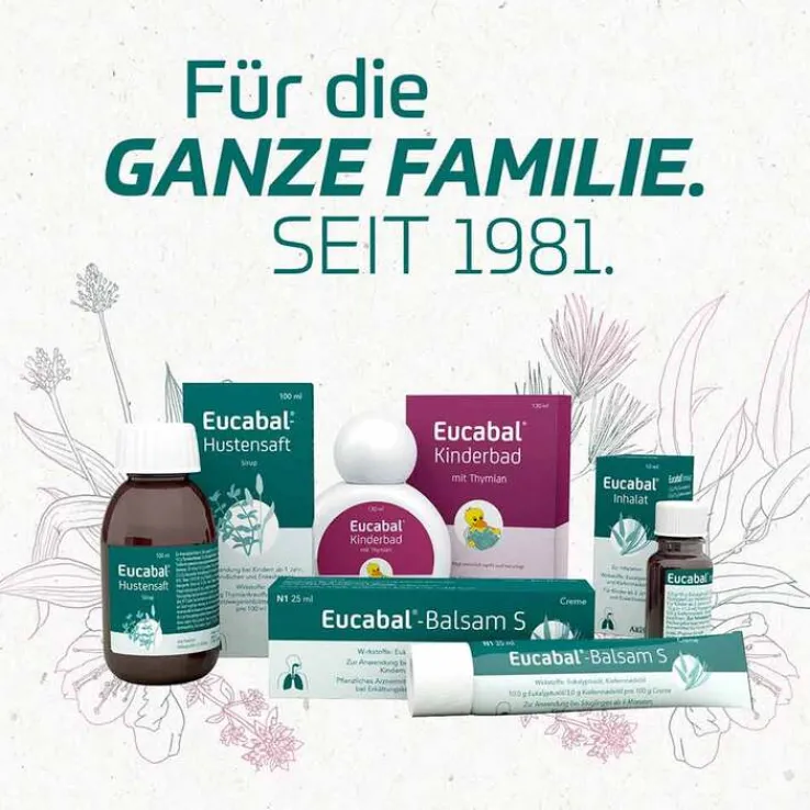 Eucabal® Kinderbad erhalten Sie in den Packungsgrößen 7 x 5 ml Portionsbeutel und in der 130 ml Flasche. Nur in Apotheken.