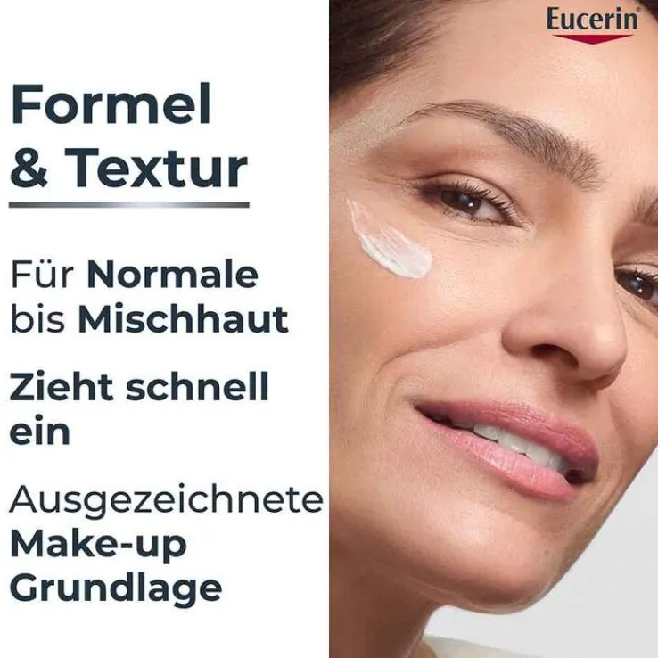- Für zusätzlichen Sonnenschutz insbesondere bei längerer Sonneneinstrahlung tagsüber das Eucerin® Photoaging Control Face Sun Fluid LSF 50+ verwenden, um die Haut umfassend vor UV-bedingter Hautalterung zu schützen