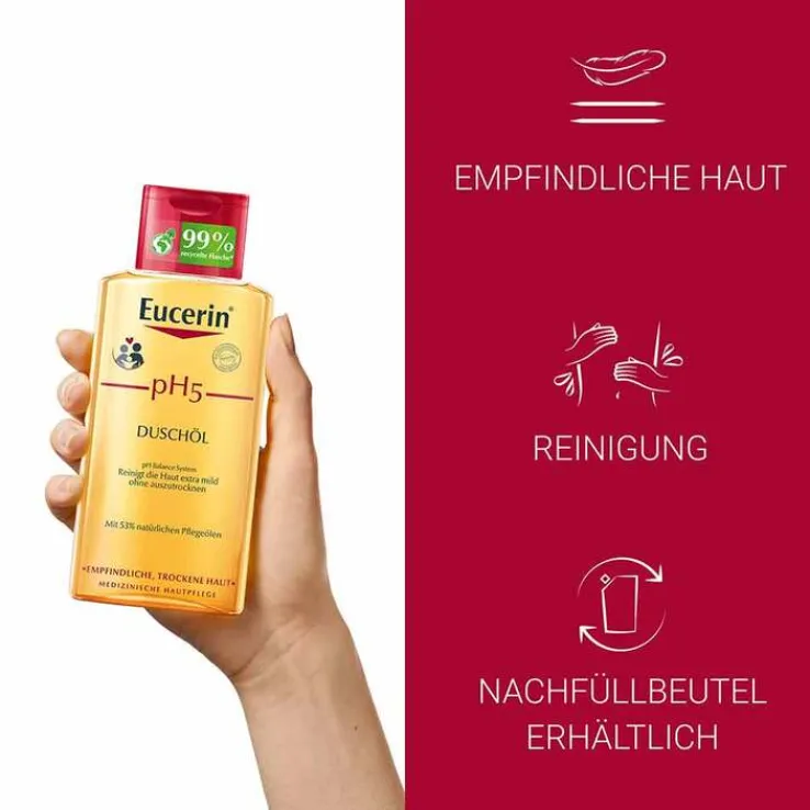 Eucerin pH5 Duschöl wurde speziell mit extra milden Tensiden zur Reinigung trockener, empfindlicher Haut entwickelt. Die Formel mit dem natürlichen pH-Wert und Dexpanthenol bewahrt nachweislich die natürliche Schutzfunktion und Widerstandskraft der Haut und reinigt sanft mit einem hohen Anteil natürlicher Pflegeöle.
