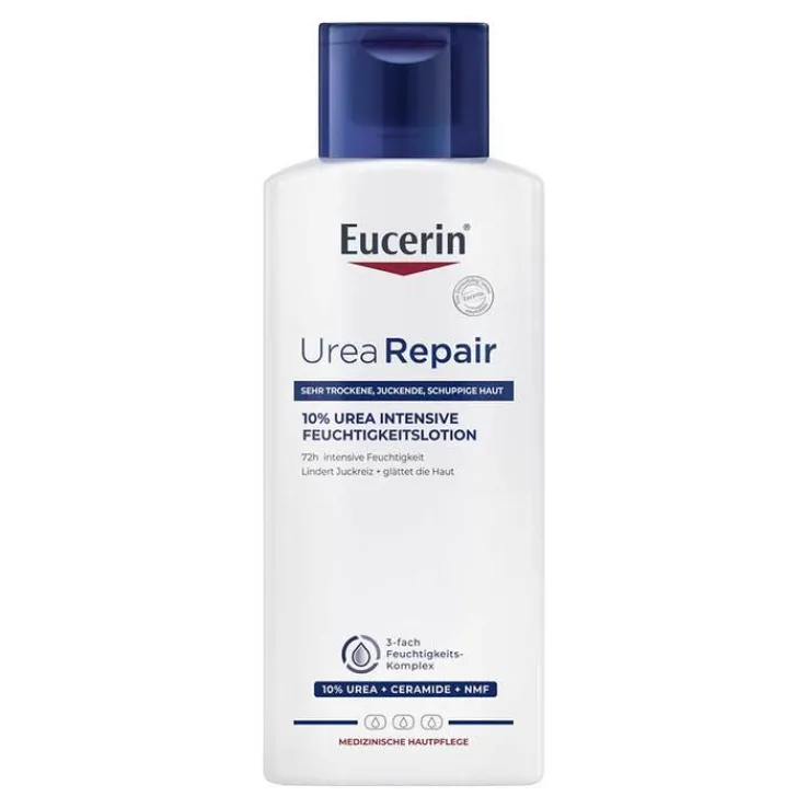 Die Eucerin UreaRepair Lotion 10% pflegt hochwirksam bei sehr trockener bis extrem trockener Haut. In ihrem Repair-PLUS-Komplex kombiniert die Bodylotion die Wirkstoffe Urea, Ceramide sowie die natürlichen Feuchthaltefaktoren. So wird die Feuchtigkeitsbindung der Haut verbessert und der Lipid-(Fett-) und Feuchtigkeitshaushalt wieder in ein natürliches Gleichgewicht gebracht.