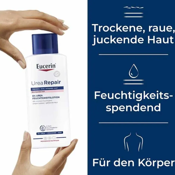 Mit der Hautpflege aus der UreaRepair Serie bietet Eucerin das, was das neue unabhängige Expertenpapier empfiehlt: Lotionen und Cremes mit einem hohen Urea-Anteil, um der Hauttrockenheit effektiv entgegenzuwirken.