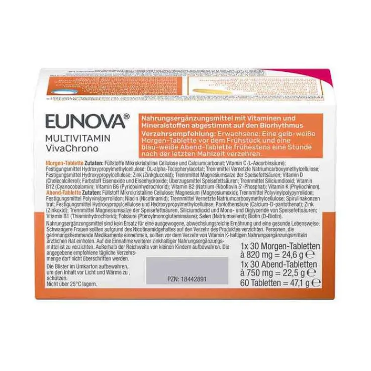 Eine sinnvolle Nährstoffversorgung findet im Einklang mit der inneren Uhr statt. Eunova VivaChrono ist auf den 24h-Takt des Körpers abgestimmt – und unterstützt so mit einer speziellen Nährstoffkombination am Tag den Energiestoffwechsel und die Widerstandskraft des Körpers, in der Nacht trägt es zur Erholung und Regeneration bei.¹ ² ³ ⁴ ⁵ Durch die Kombination aus einer Tablette morgens und einer für den Abend mit durchdachten Tablettentechnologie werden die Nährstoffe bequem und clever koordiniert freigesetzt.