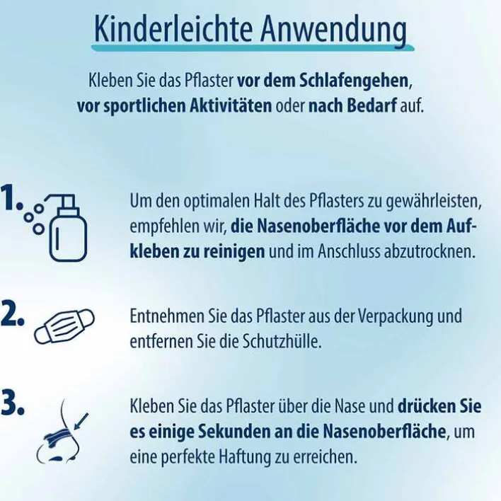 Entnehmen Sie dann das Pflaster aus der Verpackung und entfernen die Schutzhülle. Kleben Sie das Pflaster über die Nase und drücken Sie es einige Sekunden an die Nasenoberfläche um eine perfekte Haftung zu erreichen.