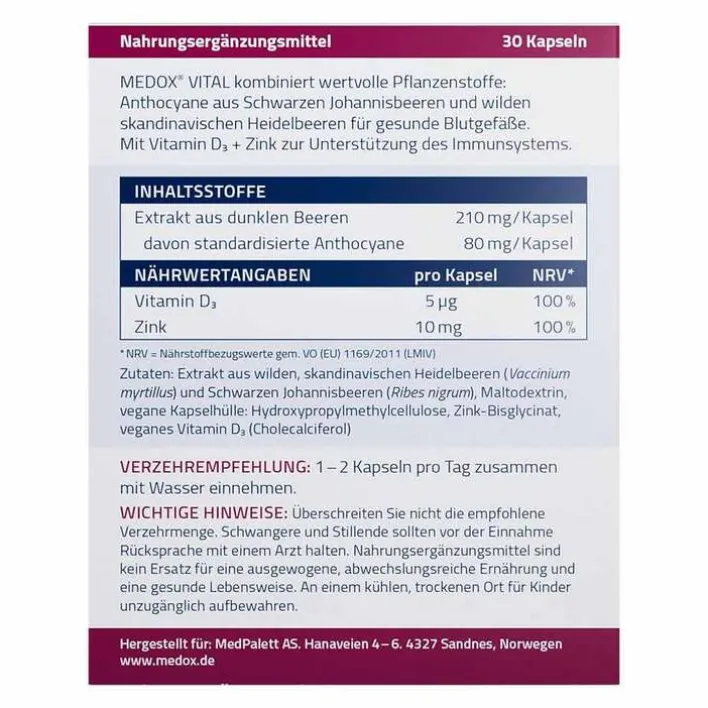 Medox Vital kombiniert als Nahrungsergänzungsmittel wertvolle Anthocyane aus wildwachsenden, skandinavischen Heidelbeeren und schwarzen Johannisbeeren mit Vitamin D3 plus Zink. Mit dieser Kombination unterstützt es die normale Funktion des Immunsystems* – und damit unser Schutzschild gegen Erkältungen und Co.