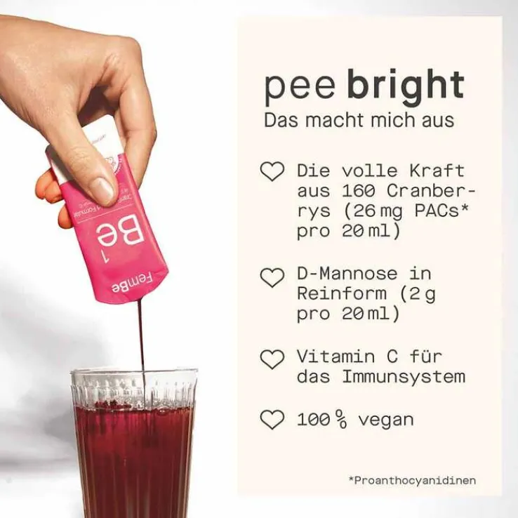 FemBe Be1 CranBe Liquid Formular vereint die wertvollen Inhaltsstoffe der Cranberry mit D-Mannose und Vitamin C in einer innovativen Flüssigform für maximale Bioverfügbarkeit. Die hochkonzentrierte Rezeptur wurde speziell entwickelt, um eine gezielte Unterstützung der Harnwege zu bieten. Ein Sachet enthält die geballte Nährstoffkraft von 160 Cranberries sowie 26 mg standardisierte Proanthocyanidine (PAC*) und 2 g D-Mannose in hochreiner Qualität.