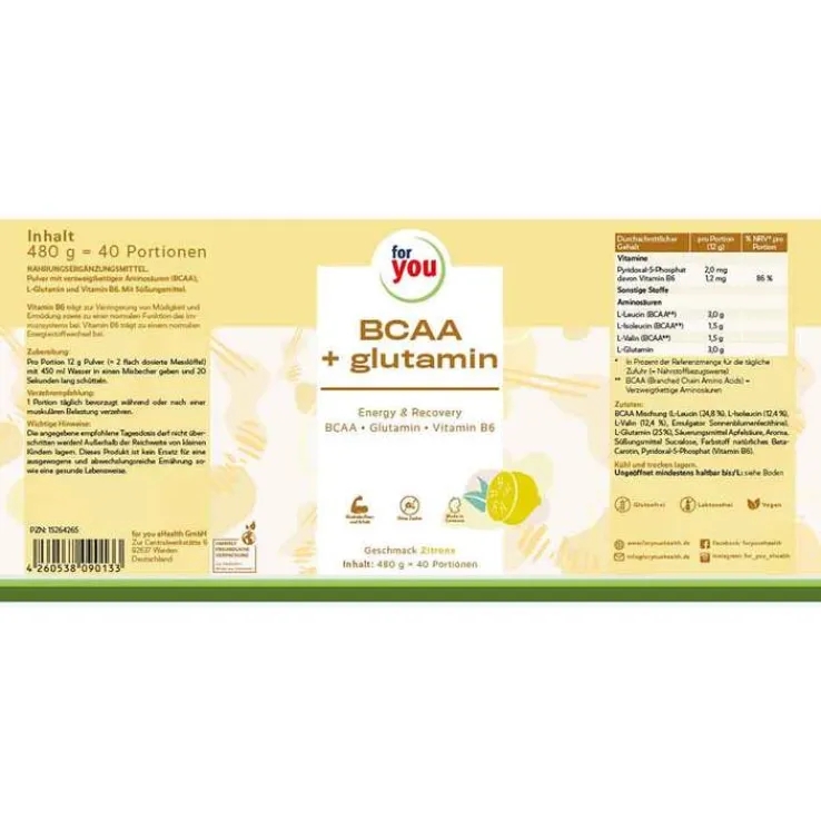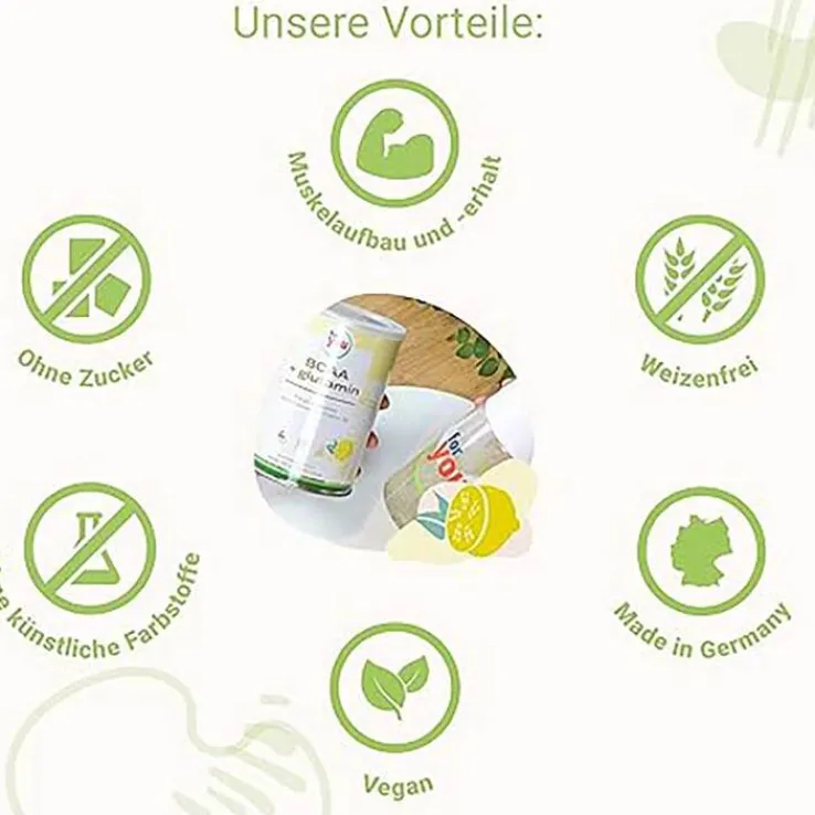 For You eHealth GmbH verwendet reine Aminosäuren und natürliche Farbstoffe. Sie erhalten ein hochwertiges BCAA-Pulver mit erfrischendem Zitronen-Geschmack.