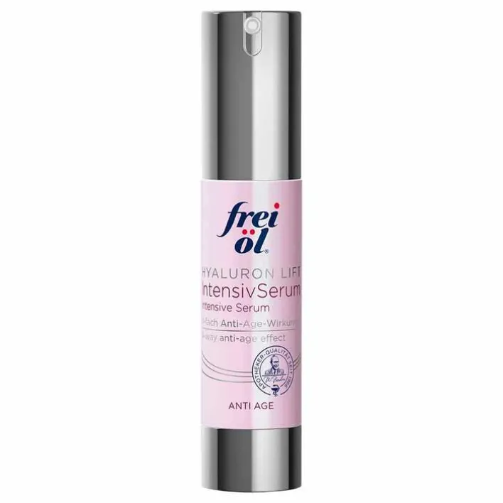 Das ultraleichte Frei Öl Anti-Age Intensiv Serum mit der extrem hohen Konzentration aus kurz-, mittel und langkettigem, pharmazeutischem Hyaluron, patentiertem Kollagenschutz und Vitaminen A und B wirkt 4-fach der Hautalterung entgegen. Das Intensivserum ist geeignet ab 30 Jahren, für erste sichtbare Fältchen, zur Vorbeugung der Faltenbildung, für tiefere Falten, bei sichtbarem Verlust an Spannkraft und nachlassender Elastizität und für Frauen in den Wechseljahren.