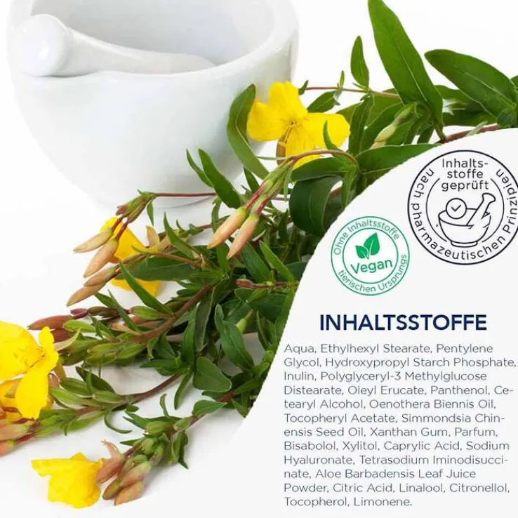 - mit Aloe vera, Bisabolol, Inulin, Jojobaöl, langkettiges Hyaluron, Nachtkerzenöl, Panthenol, Vitamin E