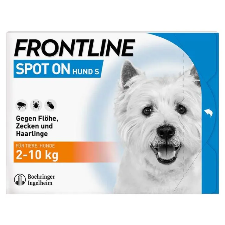 FRONTLINE® SPOT ON Hund S Lösung zum Auftropfen auf die Haut für Hunde. Wirkstoff: Fipronil. Anwendungsgebiete: Zur Behandlung von Hunden mit einem Körpergewicht von 2 kg bis 10 kg gegen Floh-, Zecken- und Haarlingsbefall. Abtötung von Flöhen (Ctenocephalides spp.). Die insektizide Wirksamkeit gegen adulte Flöhe bleibt 8 Wochen lang erhalten. Abtötung von Zecken (Ixodes ricinus, Dermacentor variabilis, Rhipicephalus sanguineus). Die akarizide Wirksamkeit gegen Zecken hält bis zu 4 Wochen an. Abtötung von Haarlingen (Trichodectes canis). Zur Behandlung und Kontrolle der Flohstichallergie (Flohallergiedermatitis = FAD). [Okt 2017] Zu Risiken und Nebenwirkungen lesen Sie die Packungsbeilage und fragen Sie Ihren Tierarzt oder Apotheker.