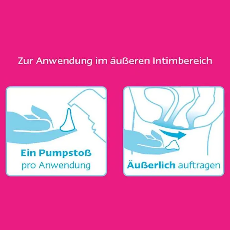 Vor dem Auftragen sollten die Hände gründlich gewaschen werden. Einen Pumpstoß des Gels auf den Zeigefinger geben und im gesamten äußeren Intimbereich (Vulva, Damm und Analbereich) verteilen.
