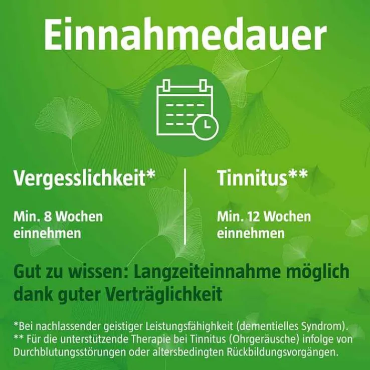 Die optimale Anwendungsdauer zur Behandlung von Vergesslichkeit sollte aufgrund der längerfristigen Wirkungsdauer mindestens 8 Wochen betragen, sofern nicht anders verordnet. Nach einer Behandlungsdauer von 3 Monaten sollte ein Arzt oder eine Ärztin prüfen, ob die Notwendigkeit für eine Weiterführung der Behandlung, zum Beispiel im Rahmen einer Langzeittherapie, gegeben ist.