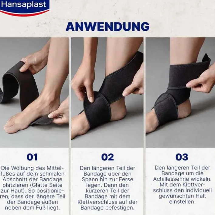 Den längeren Teil der Bandage um die Achillessehne wickeln und mit dem Klettverschluss den individuell gewünschten Halt einstellen.