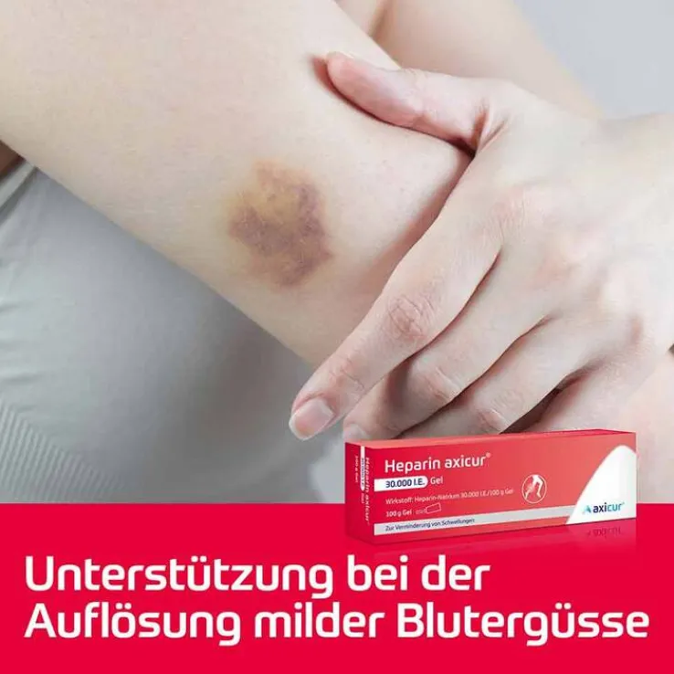 Heparin axicur® 30.000 I.E. Gel. Wirkstoff: Heparin-Natrium. Anwendungsgebiete: Zur Verminderung von Schwellungen. Anwendung auf der Haut zur unterstützenden Behandlung bei akuten Schwellungszuständen nach stumpfen Verletzungen (Prellungen, Blutergüsse). Enthält Polysorbat. Packungsbeilage beachten. Zu Risiken und Nebenwirkungen lesen Sie die Packungsbeilage und fragen Sie Ihren Arzt oder Apotheker. axicorp Pharma GmbH, 61381 Friedrichsdorf. Stand: April 2022