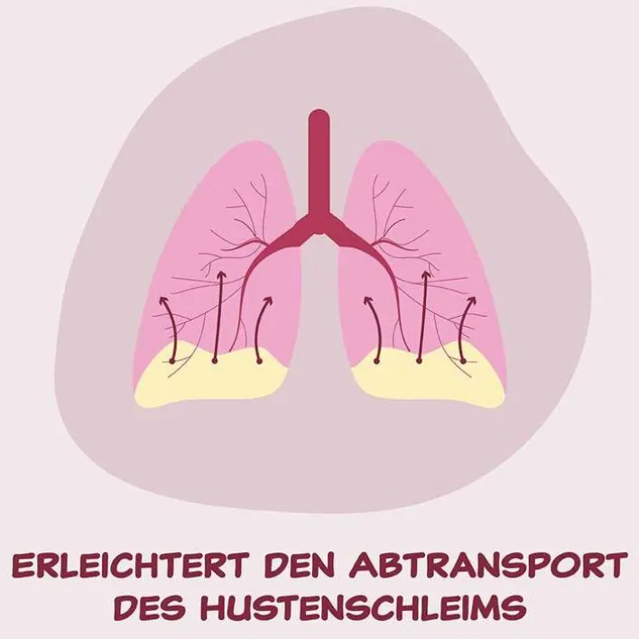 - Durch die Verflüssigung des Hustensekrets und der Unterstützung der Aktivität der Flimmerhärchen in den Atemwegen wird der Abtransport des Hustensekrets gefördert und das Abhusten des Schleims erleichtert