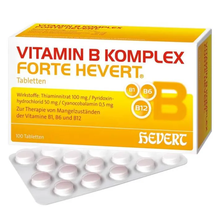 Vitamin B Komplex forte Hevert® Anwendungsgebiete: Zur Therapie nachgewiesener Mangelzustände der Vitamine B1, B6 und B12. Zu Risiken und Nebenwirkungen lesen Sie die Packungsbeilage und fragen Sie Ihre Ärztin, Ihren Arzt oder in Ihrer Apotheke.