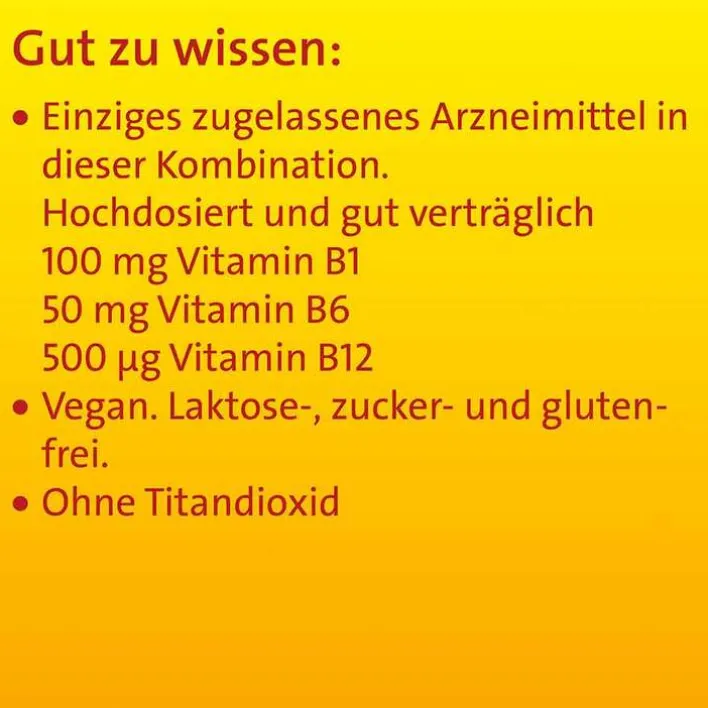 - Hochdosiert und gut verträglich: 100 mg Vitamin B1, 50 mg Vitamin B6, 500 µg Vitamin B12