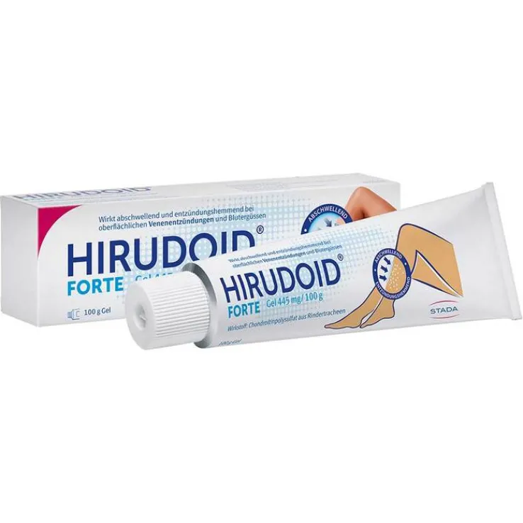 HIRUDOID® FORTE Gel 445 mg/100 g. Wirkstoff: Chondroitinpolysulfat aus Rindertracheen. Zur lokalen Behandlung von stumpfen Verletzungen (Traumen) mit und ohne Bluterguss (Hämatom), oberflächlicher Venenentzündung, sofern diese nicht durch Druck von Außen (Kompression) behandelt werden kann. Enthält Propylenglycol. Zu Risiken und Nebenwirkungen lesen Sie die Packungsbeilage und fragen Sie Ihre Ärztin, Ihren Arzt oder in Ihrer Apotheke. STADA GmbH, Stadastraße 2-18, 61118 Bad Vilbel. Stand: Juni 2013