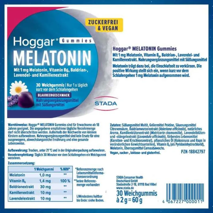 Die Weichgummis mit leckerem Blaubeergeschmack von Ihrem Einschlafexperten Hoggar® tragen dazu bei, die Einschlafzeit zu verkürzen.* Sie enthalten Melatonin, Vitamin B6, Baldrian-, Lavendel- und Kamillenextrakt. Die positive Wirkung stellt sich ein, wenn kurz vor dem Schlafengehen 1 mg Melatonin (1 Weichgummi) aufgenommen wird.*