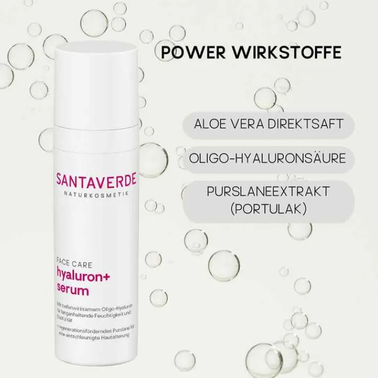 Das Santaverde Hyaluron+ Serum sorgt für Langzeit-Feuchtigkeit und mehr Elastizität. Es enthält reinen Bio-Aloe Saft, Oligo-Hyaluron und Purslane-Extrakt für feuchtigkeitsarme, gestresste und sensible Haut. Das Serum fördert die Hautregeneration.