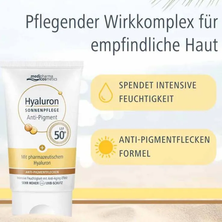 Die Hyaluron Sonnenpflege Anti-Pigment LSF 50+ von medipharma cosmetics schützt empfindliche Gesichtshaut zuverlässig vor der Sonne und Pigmentflecken, während sie sie zugleich intensiv mit Feuchtigkeit versorgt – auch bei starker Sonneneinstrahlung.