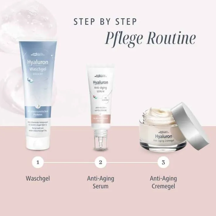 Für eine gründliche Pflege-Routine werden folgende Schritte empfohlen: Gestartet wird mit dem Hyaluron Waschgel, anschließend wird das Hyaluron Feuchtigkeit Serum auf die Haut aufgetragen und zum Schluss wird das Hyaluron 48h Feuchtigkeit Cremegel angewandt. Das Waschgel reinigt und entfernt Make-Up sowie überschüssigen Talg, das leichte, fast wässrige Serum spendet Feuchtigkeit mit Soforteffekt und das Cremegel versorgt die Haut langanhaltend mit Feuchtigkeit. Für eine Hautpflege mit System.