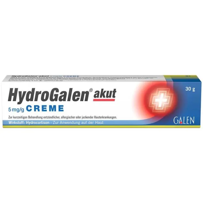 HydroGalen® akut 5 mg/g Creme. Wirkstoff: Hydrocortison. Anwendungsgebiete: HydroGalen® akut 5 mg/g ist eine entzündungshemmende Creme zur Anwendung auf der Haut. Sie wird angewendet zur kurzzeitigen (maximal 2 Wochen) Anwendung zur Behandlung von entzündlichen, allergischen oder juckenden Hauterkrankungen mit mäßiger Ausprägung, die auf eine äußerliche Therapie mit schwach wirksamen Kortikosteroiden ansprechen. Für Erwachsene und Kinder ab dem vollendeten 6. Lebensjahr. Zu Risiken und Nebenwirkungen lesen Sie die Packungsbeilage und fragen Sie Ihre Ärztin, Ihren Arzt oder in Ihrer Apotheke. Stand: Mai 2020. GALENpharma GmbH, Wittland 13, 24109 Kiel