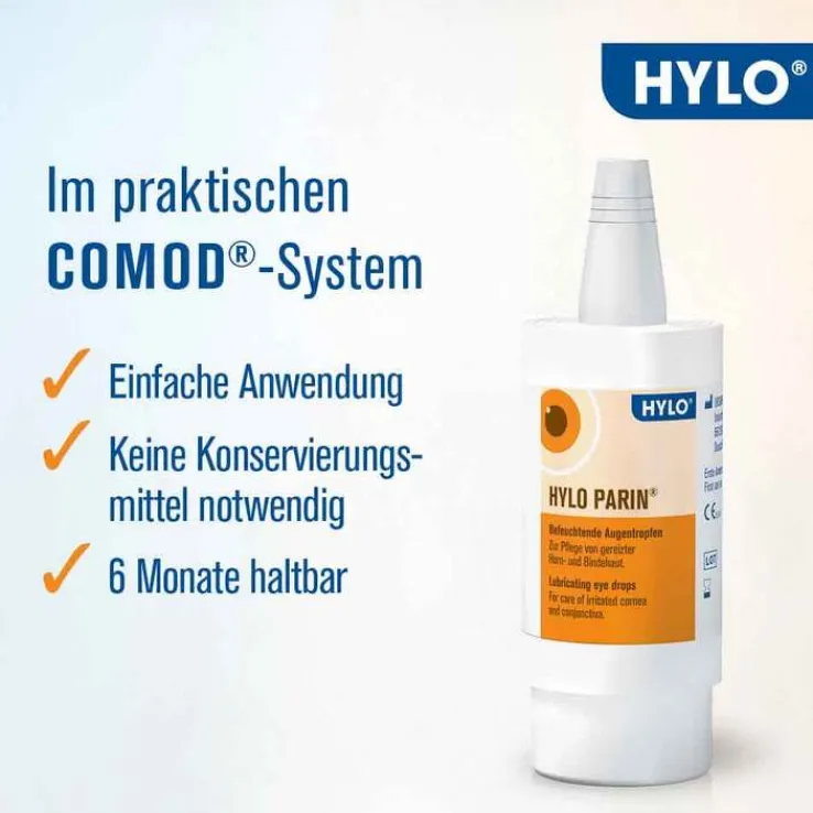 HYLO PARIN® wurde gezielt auf die Bedürfnisse trockener und wiederkehrend gereizter Augen abgestimmt. Die Kombination von Hyaluronsäure und Heparin unterstützt die effiziente Befeuchtung der Augenoberfläche und die Regeneration der Hornhaut und Bindehaut. Damit bieten die Augentropfen den Schutz vor Reizungen, indem ein langanhaltender und stabiler Tränenfilm gebildet wird. Symptome wie Brennen, Rötung, Juckreiz oder ein unangenehmes Fremdkörpergefühl im Auge werden dank der langanhaltenden Stabilisierung des Tränenfilms gelindert. Wie alle Augentropfen der HYLO® Produktfamilie kommt HYLO PARIN® ohne Konservierungsmittel und Phosphate aus. Damit sind die Augentropfen besonders gut verträglich und eignen sich auch für die Anwendung mit Kontaktlinsen. Das patentierte COMOD® Systems ermöglicht zudem eine einfache und exakte Dosierung der Augentropfen, ist mit mindestens 300 Tropfen pro Flasche sehr ergiebig und 6 Monate nach Anbruch haltbar.