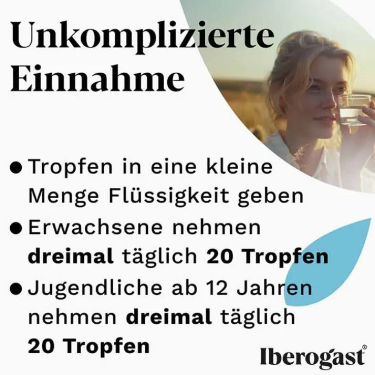 Soweit vom Arzt nicht anders verordnet, wird Iberogast Advance 3-mal täglich vor oder zu den Mahlzeiten mit etwas Flüssigkeit (vorzugsweise Wasser) eingenommen.