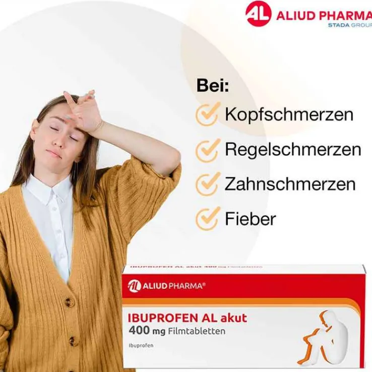 IBUPROFEN AL akut 400 mg Filmtabletten Zur Anwendung bei Kindern ab 6 Jahren, Jugendlichen und Erwachsenen. Wirkstoff: Ibuprofen. Zur kurzzeitigen symptomatischen Behandlung von leichten bis mäßig starken Schmerzen, wie Kopfschmerzen, Zahnschmerzen, Regelschmerzen, Fieber. Hinweis: Bei Schmerzen oder Fieber ohne ärztlichen Rat nicht länger anwenden als in der Packungsbeilage vorgegeben! Zu Risiken und Nebenwirkungen lesen Sie die Packungsbeilage und fragen Sie Ihre Ärztin, Ihren Arzt oder in Ihrer Apotheke. ALIUD PHARMA GmbH, Postfach 1380, 89146 Laichingen Stand: Dezember 2023