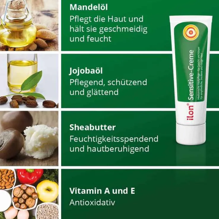 ilon Sensitive-Creme ist eine sehr hochwertige Intensivpflege für trockene und empfindliche Haut. Sie wurde unter anspruchsvollen dermatologischen Gesichtspunkten speziell für die Gesichts- und Körperpflege entwickelt und ist auch hervorragend für zarte Babyhaut geeignet.