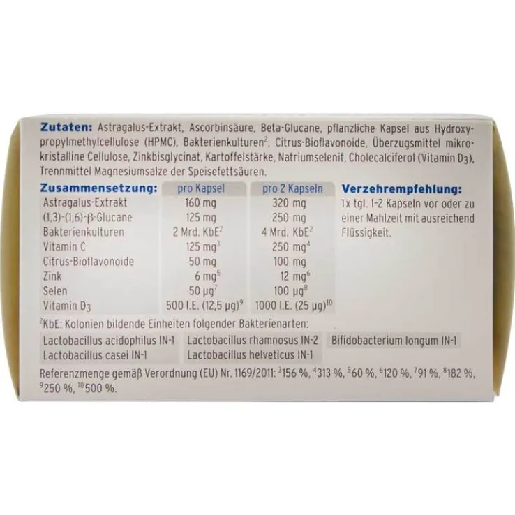 Astragalus-Extrakt, Ascorbinsäure, beta-Glucane, pflanzliche Kapsel aus Hydroxypropylmethylcellulose (HPMC), Bakterienkulturen, Citrus-Bioflavonoide, Überzugsmittel mikrokristalline Cellulose, Zinkbisglycinat, Kartoffelstärke, Natriumselenit, Cholecalciferol (Vitamin D3), Trennmittel Magnesiumsalze der Speisefettsäuren.